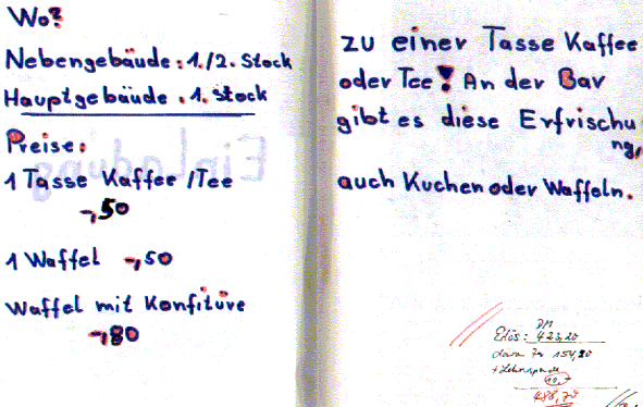 An den Elternsprechtagen in der Kuhlo-Realschule am heutigen Donnerstag von 9 bis 12 und am morgigen Freitag von 16 bis 19 Uhr wartet die Klasse 10a mit Kaffee und Kuchen sowie einem kleinen Basar auf. Der Erlös soll einer Privatschule auf den Philippinen zugute kommen. Das Westfalen-Blatt ergänzte: Es werden auch Kaffee, Tee und Waffeln geboten.