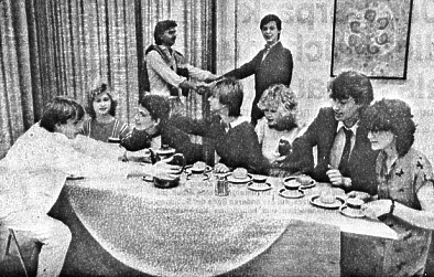Ihr selbst geschriebenes Stück "Traut den Werbeleuten nicht" boten am Mittwoch Schüler der 10. Klassen der Bielefelder Kuhlorealschule in der Altentagesstätte Auf der Schanze. Eduard Friesen, Anke Kaja, Natascha und Stefanie Budenholz, Harald Zinßer, Brigitte Bergen, Heiko Schüchter, Arne Neubarth, Ulf Meier spielten mit; ebenso die beiden Autoren des Stücks, Ulf Lahrberg und Christian Klause. Entstanden ist die Persiflage auf den Konsum von durch die Werbung schmackhaft gemachten Artikeln des täglichen Bedarfs innerhalb einer von Lehrerin Gisela Bremer betreuten Theaterarbeitsgemeinschaft. Die Schüler spielten das Stück bereits mehrfach innerhalb der eigenen Schule. Nächste Woche sind sie damit in Münster bei einem Wettbewerb vertreten. (vz)