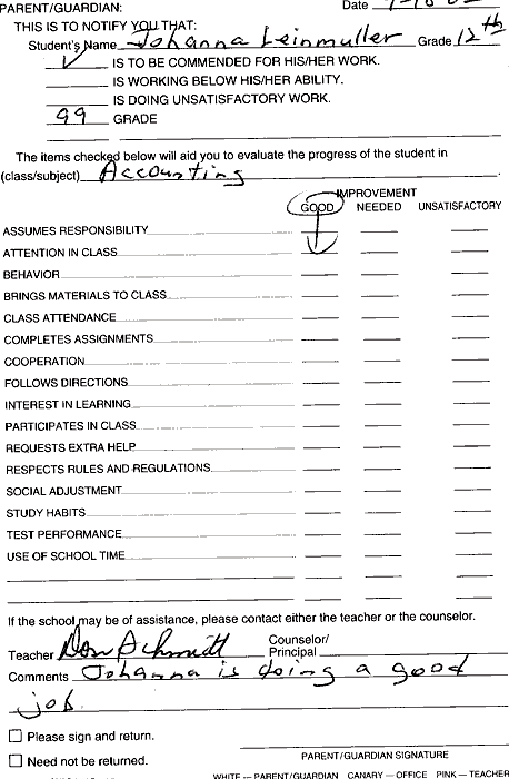 Hab inzwischen auch schon meine ersten Report Cards bekommen. Das ist sowas